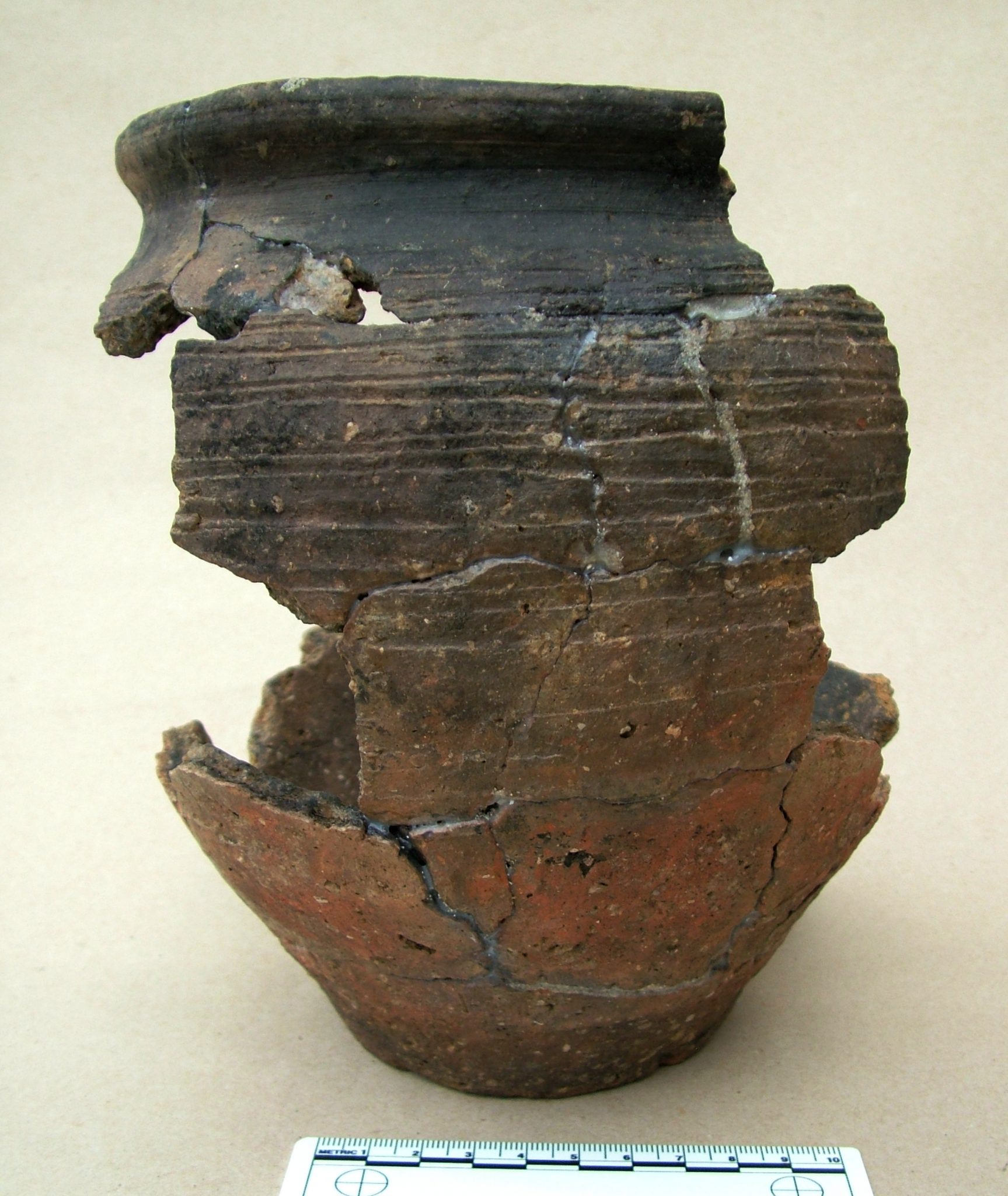 Call it sixth sense or luck, but with my two helpers, Phillip and Barrie we came directly over the butt ends of both terminating ditches. The infill conformed to the previous trenches dug across the periphery ditches of the RB site in that much of the bottom section consisted of large flints dumped without soil followed by a variety of clay/loam/flints/ashes and much blue/grey burnt flint. Interspersed amongst this infill is a large amount of broken pottery with the majority having clean un-abraded edges. Dating has shown that the time span of this pottery is in excess of 100 years containing as it does late Iron Age to early Roman pottery c 100AD creating the mystery of where all this pot material originally came from.